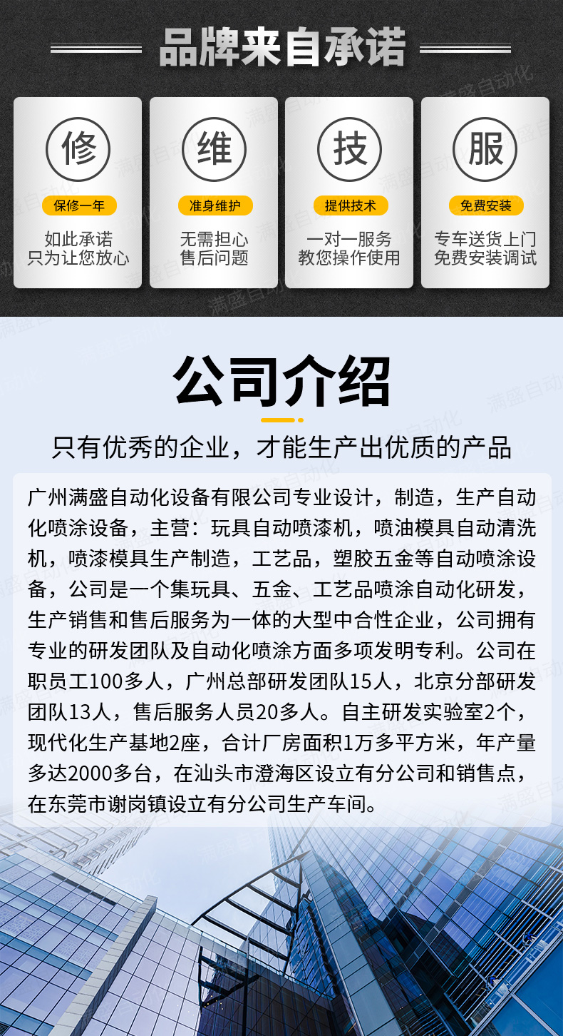 廣州滿盛自動化設備有限公司(http://www.msptsb.com)是一個集噴漆機,全自動噴漆機,玩具噴漆機,玩具自動噴漆機,玩具全自動噴漆機等研發,生產,銷售和售后服務為一體的大型綜合性企業。公司有研發團隊及自動化噴涂方面多項發明專利。公司在職員工100多人,廣州總部研發團隊15人,北京分部研發團隊13人,售后服務人員20多人。自主研發實驗室2個,現代化生產基地2座,合計廠房面積1萬多平方米,年產量開達2000多臺。